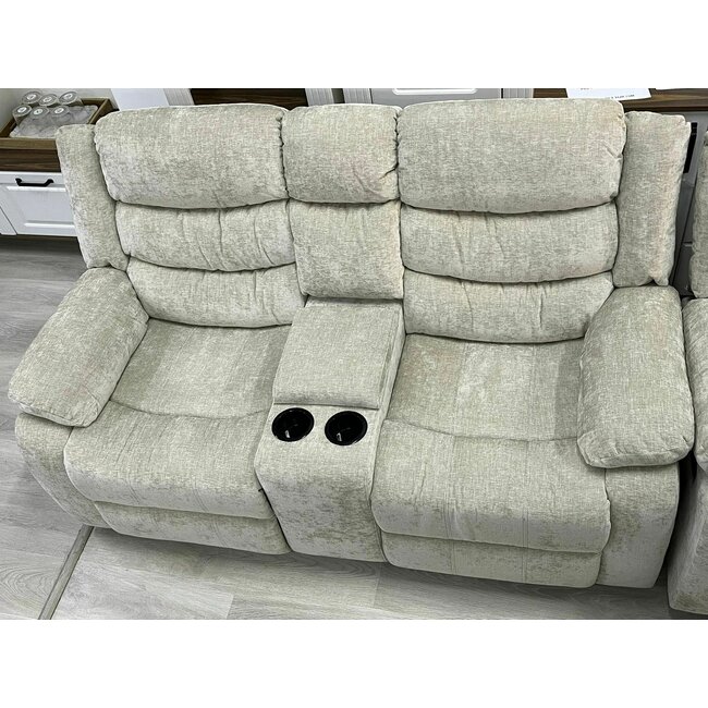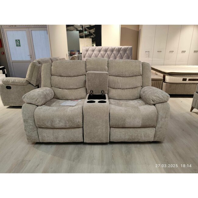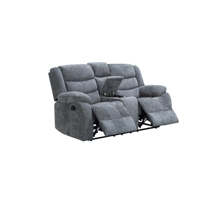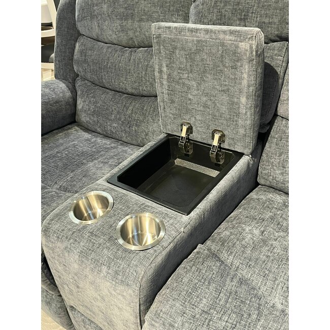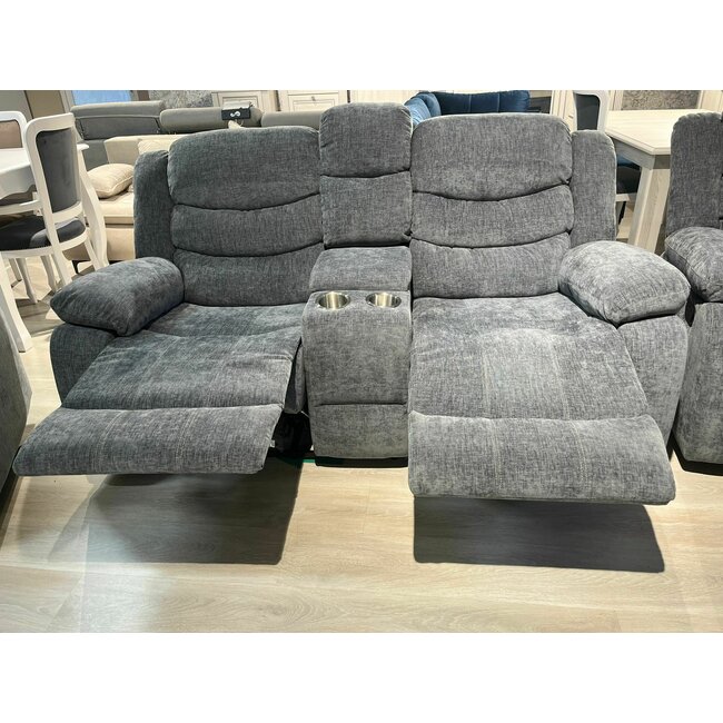 Canapeaua recliner de culoare gri are 2 locuri cu suport pentru picioare, suport pentru pahare si spatiu de depozitare, oferind un confort superior și o experiență de relaxare inegalabilă.