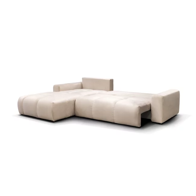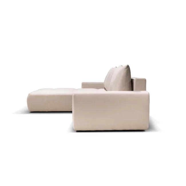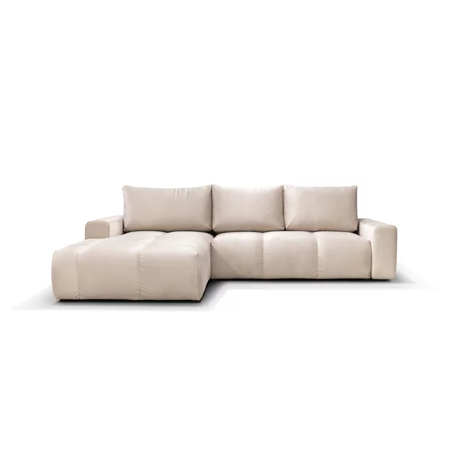Forma în L asigură spațiu generos pentru relaxare, iar paleta de culori neutre permite integrarea armonioasă în decoruri variate, de la stiluri minimaliste până la accente naturale sau moderne.