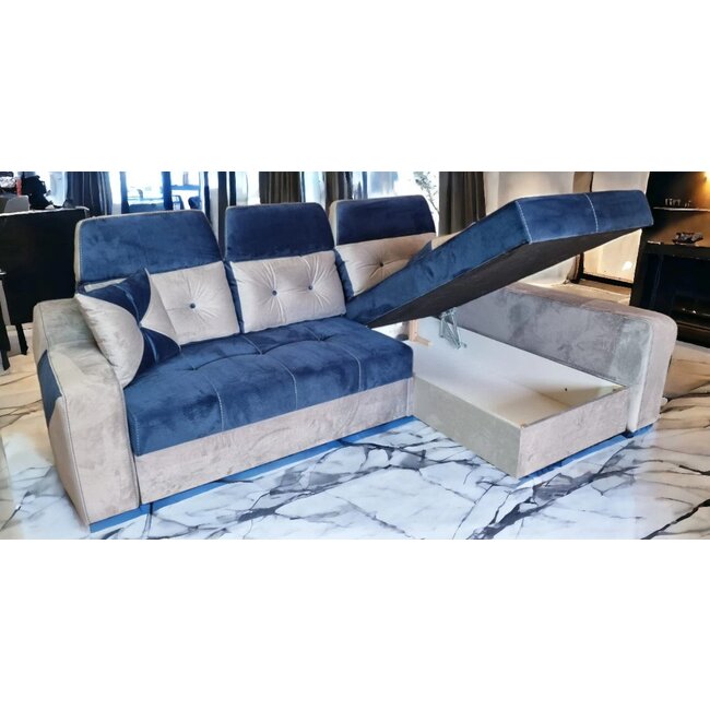 Colțar Viena Tip 1 extensibil, tetieră reglabilă, ladă depozitare, 264x168 cm, Gri