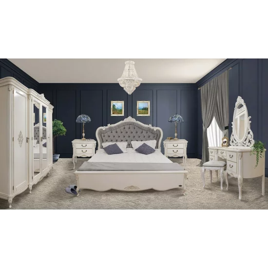Dulapul de haine, un element central al camerei, este echipat cu oglinzi ample, rame elaborate și sculpturi manuale, oferind nu numai funcționalitate, dar și un punct de atracție vizual. Masa de toaletă cu oglindă este desăvârșită, mărginită de finisaje albe și aurii, în timp ce oglinda detaliată completează ansamblul cu un aer de noblețe și distincție. Fiecare piesă a setului Izabela a fost concepută cu o atenție deosebită pentru detalii, rezultând un dormitor care este nu numai un loc de odihnă, ci și un spațiu de expresie personală și estetică desăvârșită.