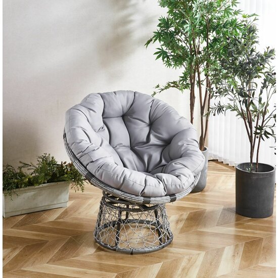 Scaun rotativ la 360 de grade, are o impletitură tip rattan din polietilenă; cadru din oțel galvanizat; suport și bază din metal; pernă din poliester; culoarea cadrului metalic: gri; culoarea pernelor: gri; greutatea maximă suportată: 160 kg; protecție UV; rezistență la intemperii; durată de viață îndelungată; umplutură din poliester;