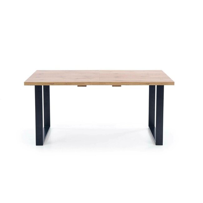 Masă Venom extensibilă cu blat furniruit și margini ABS, structură metalică, 135-185x90x74 cm, stejar/negru