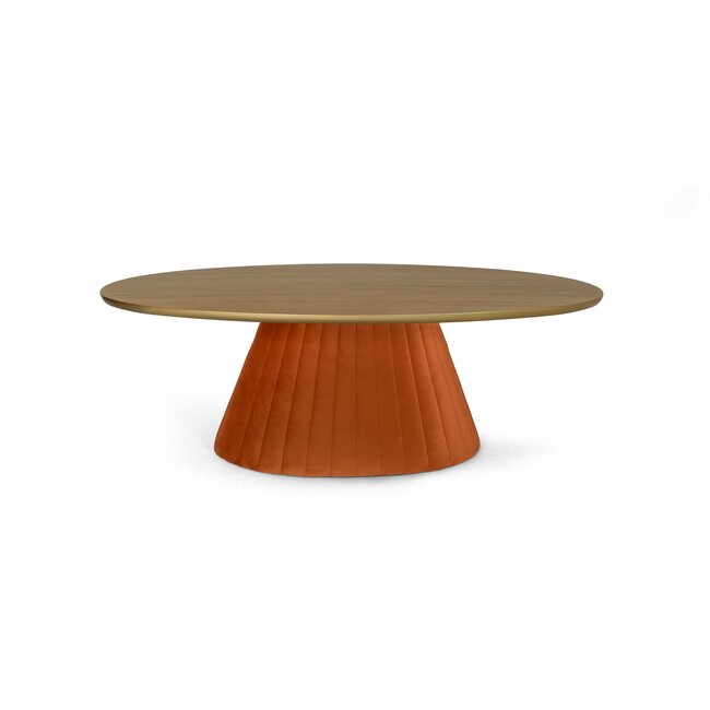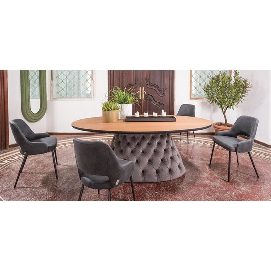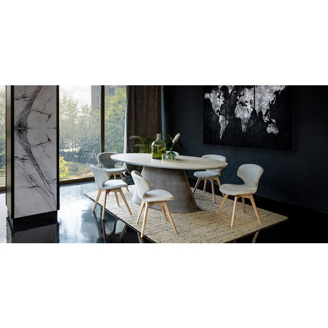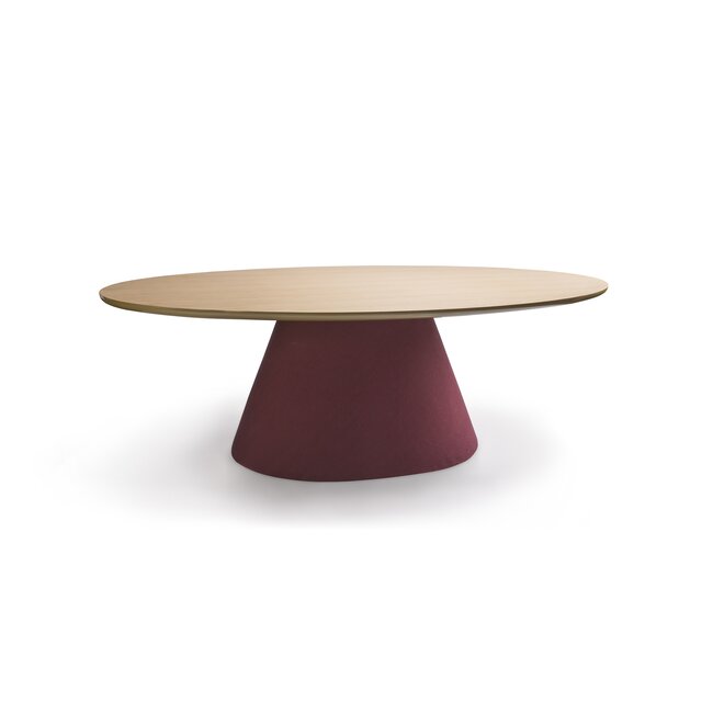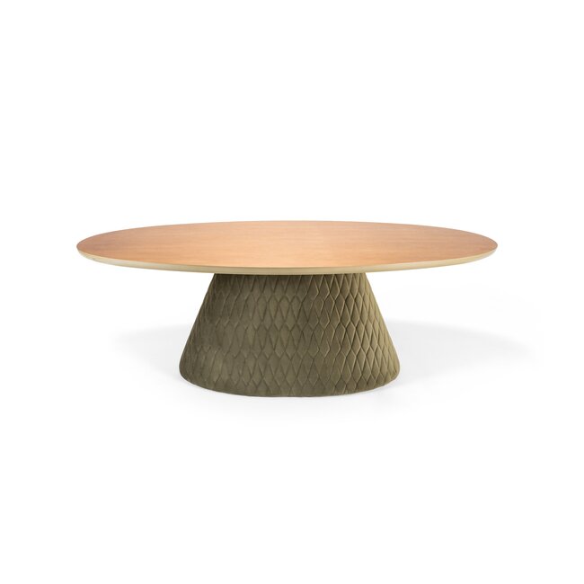 Masa Oslo ovala combină aspectul modern, variat clorat al materialului textil cu caracterul atemporal al lemnului.