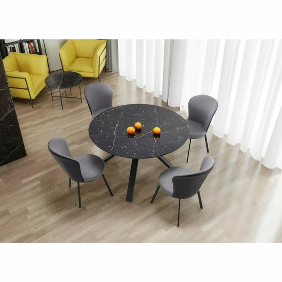 Masă Vertigo reglabilă, blat sticlă ultradură marmură neagră, cadru oțel, 130-180x130x76 cm, negru