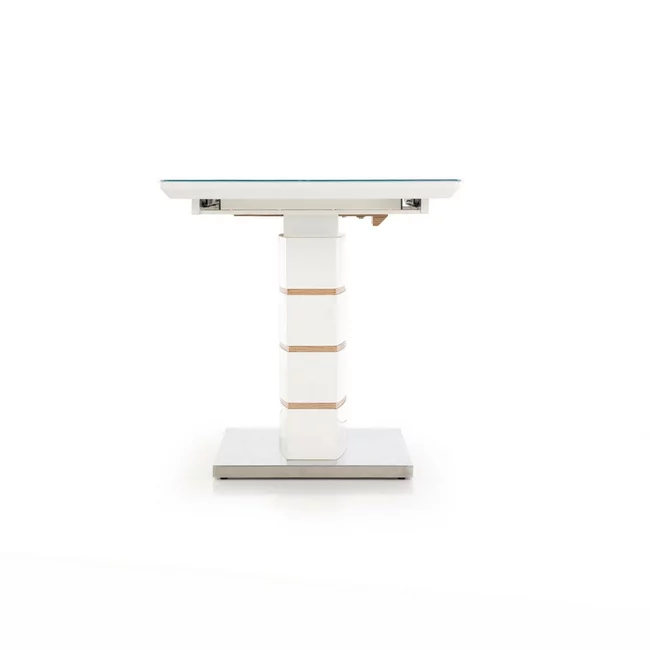 Masă Toronto extensibilă, MDF lucios, furnir natural și sticlă, 140-180x80x76 cm, alb/stejar auriu