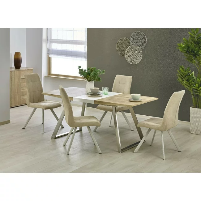 Masă Trevor extensibilă, MDF laminat și oțel inoxidabil, 130-170x80x76 cm, Sonoma/alb