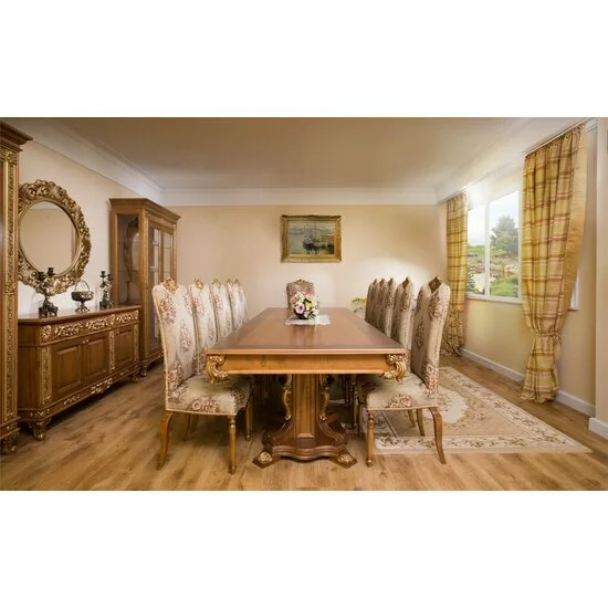 Ansamblul este centrat în jurul unei mese robuste de lemn masiv de fag și tei, care stă mândră pe un set de picioare sculptate artistic, înflorite cu accente aurii care strălucesc pe tonul cald al lemnului.
