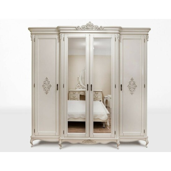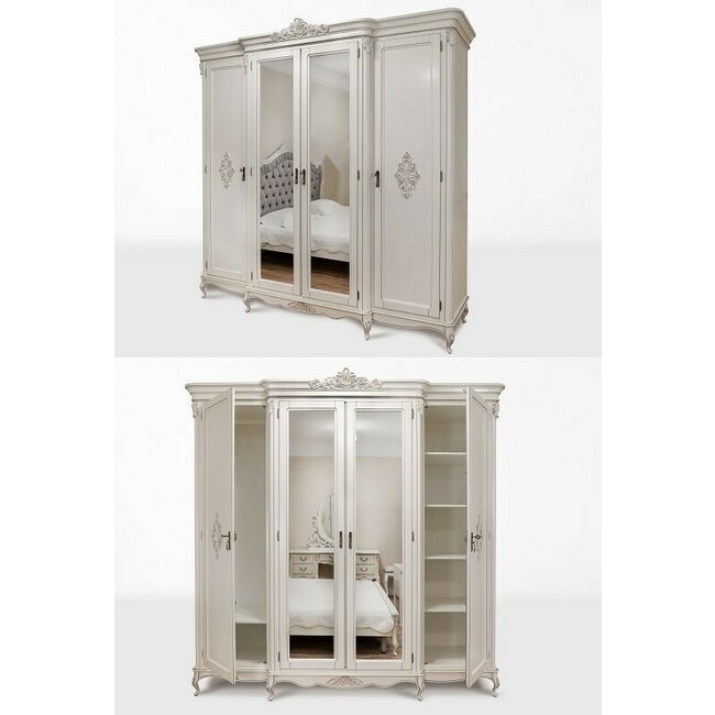 Dulap Izabela, 4 uși, oglinzi integrate, structură lemn masiv sculptat manual + PAL, spațiu depozitare generos, 235.2x68.4x237.5 cm, alb patinat