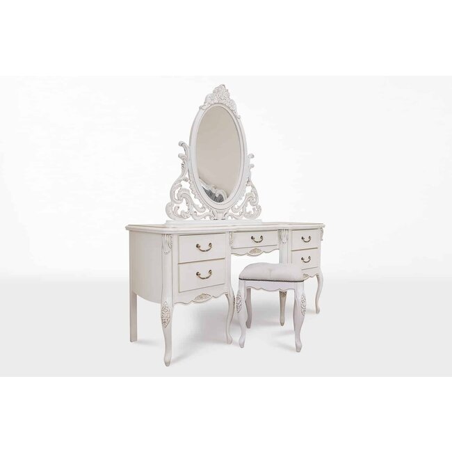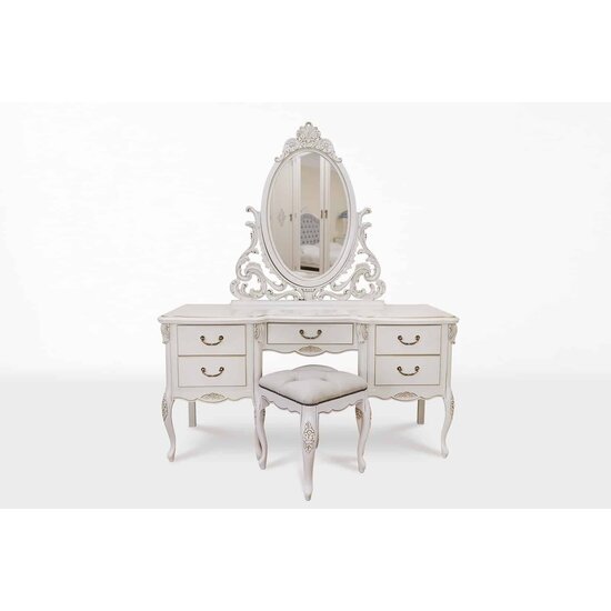 Set măsuță de toaletă + oglindă + taburet Milly, structură lemn masiv + PAL, design elegant, 160x55x80 cm, alb patinat