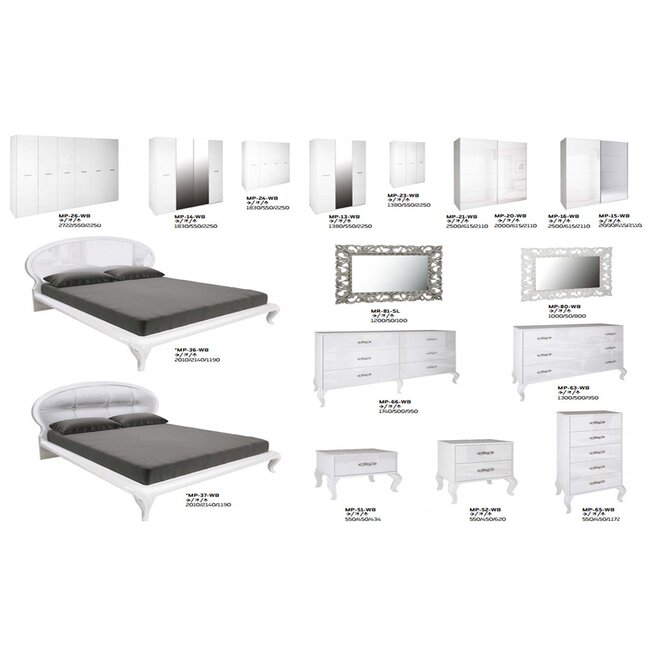 Dormitor Imperia, cu dulap 4 uși, pat tapițat 160x200 cm, 2 noptiere, comodă înaltă, alb lucios