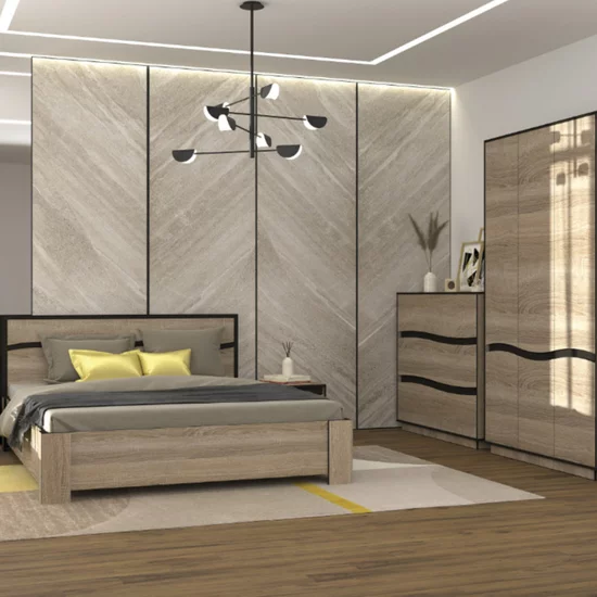 Setul conține: Pat 160x200, dulap 3 usi, comoda 3 sertare, 2 noptiere.
