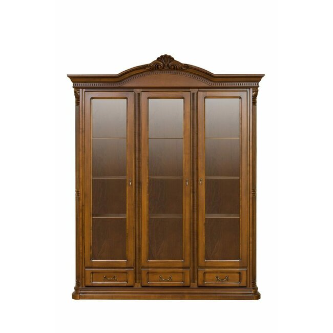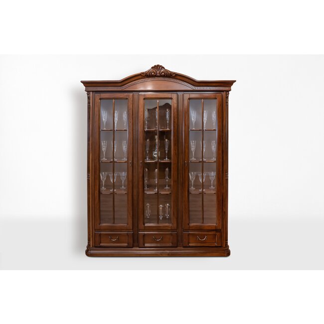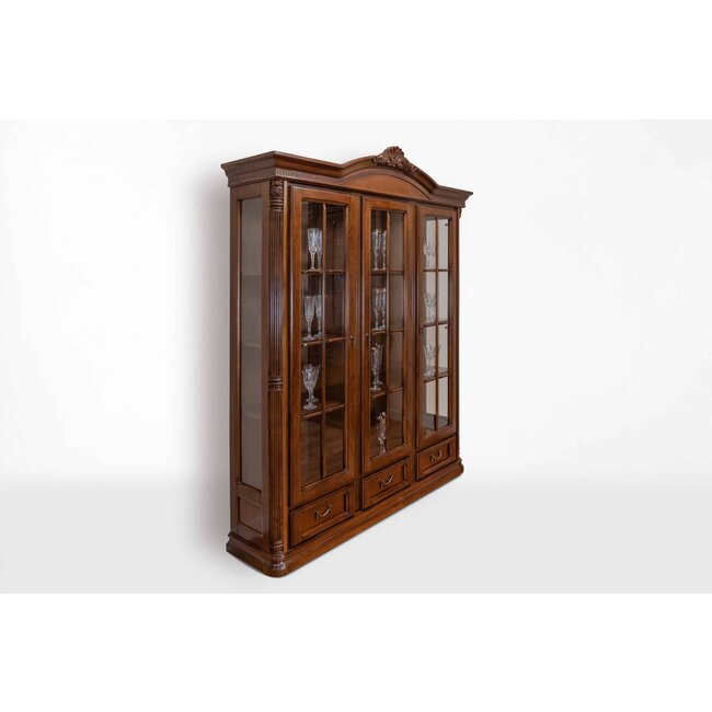 Cristalier Sonia cu 3 uși din lemn masiv fag, panel și MDF, furniruit cu furnir de nuc, 178x45,5x220 cm