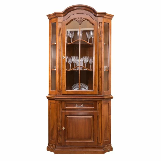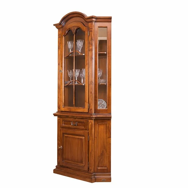 Vitrină colț Mara din lemn masiv fag, panel și MDF, furniruit cu furnir de nuc, 76x76x140 cm