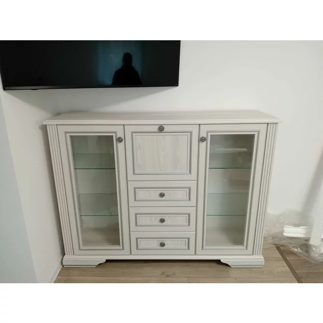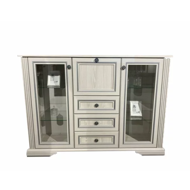 Comodă White 2W3S1B, 2 uși vitrate, 3 sertare și bar integrat, MDF și PAL melaminat, mânere metalice, 161x45x119 cm, frasin alb/pin argintiu