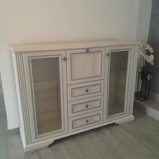 Comoda white 2w3s1b contine 2 usi cu sticla, 3 sertare si o usa tip bar.