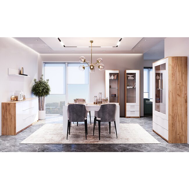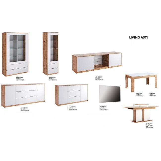 Fronturile alb lucios impeuna cu carcasa in culoarea lemnului de stejar sunt combinatia perfecta pentru eleganta in stilul minimalist. Livingul Asti este o alegere perfecta pentru apartamentele moderne si poate fi combinat cu componente din dormitorul Asti. Materialul folosit este pal de 18 mm, vopsit in trei straturi si uscat sub razele ultraviolete.