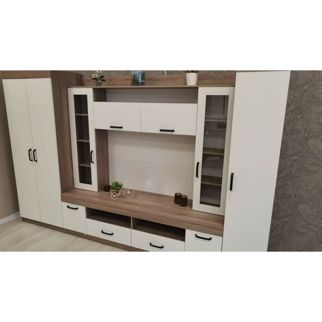Livingul Veronica are un dulap, o trusă cu rafturi, o secțiune TV și un număr mare de rafturi închise pentru lucrurile tale. Culoare: trufa de stejar Sonoma+Bej.