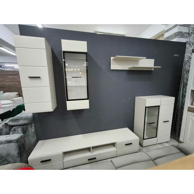 Setul include: Comoda TV, dulap, 2 vitrine, raft suspendat.