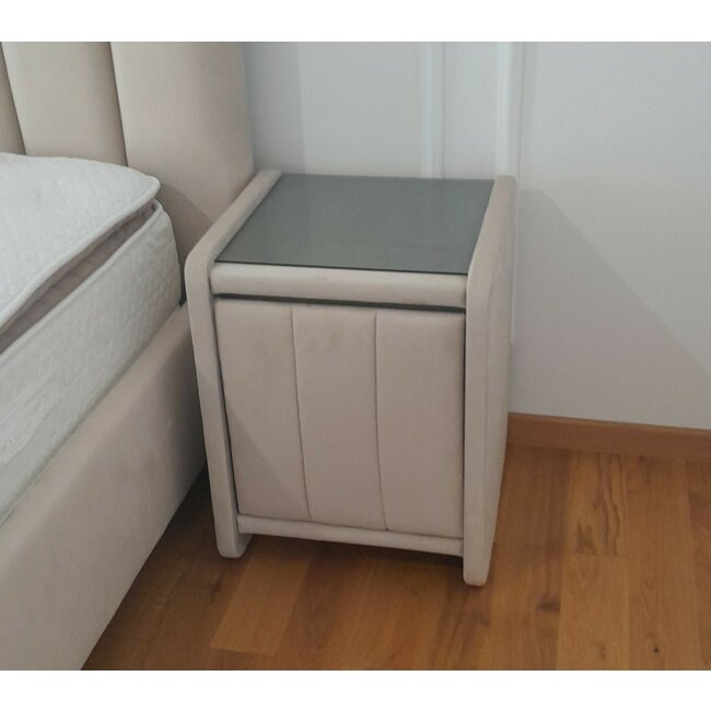 Noptieră Fancy, design modern, tapițată cu stofă, PAL și sticlă, 47.5x59.5x45.5 cm, bej