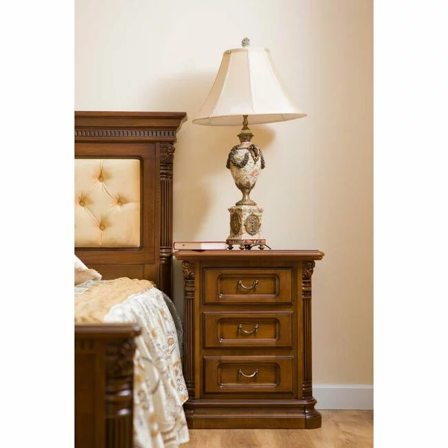Noptieră Sonia, compartimentare practică + detalii rafinate, lemn masiv fag + MDF furniruit, 58x42x67 cm, nuc