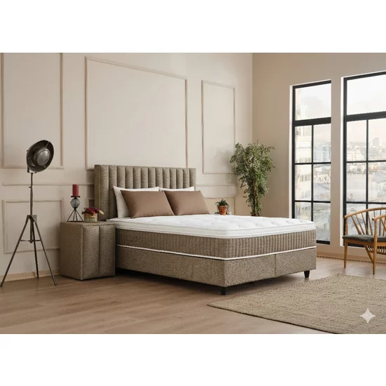 Tăblia înaltă, cu cusături verticale elegante, nu oferă doar un aspect sofisticat, ci și un suport ergonomic excelent pentru momentele când doriți să citiți sau să priviți la TV în pat. Tapițeria de culoare maro este rezistentă la uzură și ușor de întreținut, aducând o notă caldă în cameră.