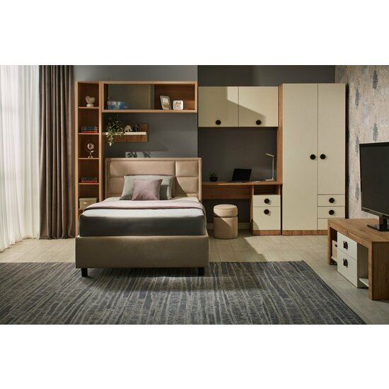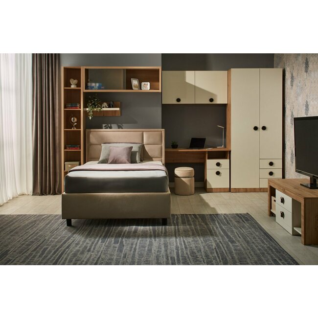 Dormitor Amigo, set modular complet, spații generoase depozitare, pat tapițat cu sertar, PAL melaminat, 120x200 cm, Artisan-Crem