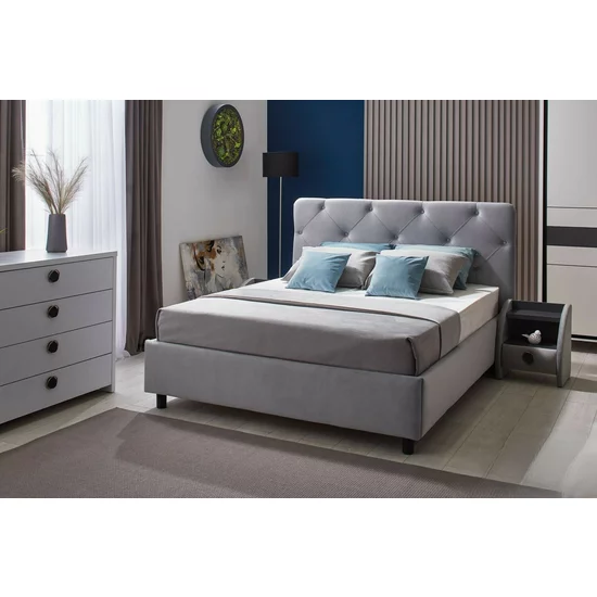 Pat tapitat cu stofa usor plusata, lada de depozitare si somiera rabatabila metalica cu lamele din lemn stratificat, aerisire lada.