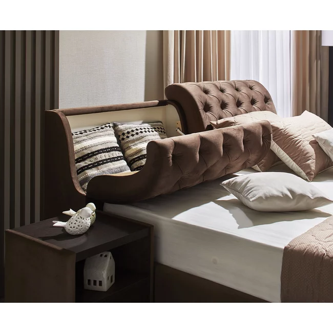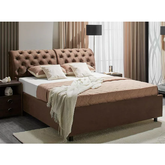 Pat Frankfurt cu spătar tapițat, stofă plușată și ladă depozitare, 180x200 cm, maro