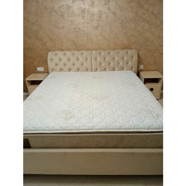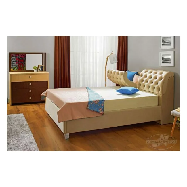 Pat Frankfurt cu spătar tapițat, stofă catifelata și ladă depozitare, 180x200 cm, bej