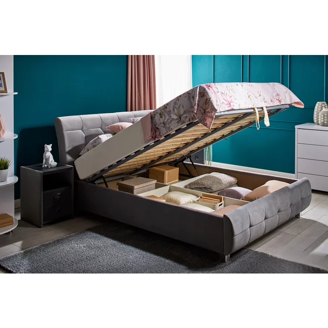 Pat Samba cu somieră rabatabilă, ladă de depozitare, spătar tapițat cu stofă catifelata, PAL melaminat, 180x200 cm, gri