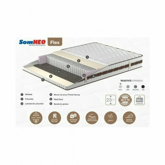 Salteaua Flex este acoperita cu stofa de tip Knitted. Poliuretan/Burete cu densitate 23kg/mc. Fasie poliuretanica. Bloc de arcuri Pocket Spring. Pasla Hard / strat aspru cu o componenta inalta de fibre naturale presate. Banda de aerisire/ofera o igiena mai eficienta, permitand circulatia aerului. Inaltime 23 cm