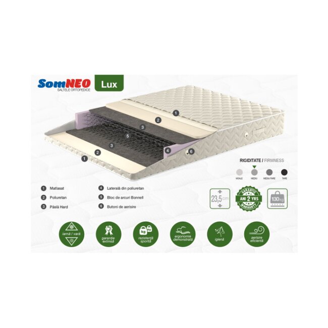 Saltea ortopedică SomNEO LUX îmbină cu succes proprietăţile ergonomice cu cele de confort. Cele două fete Iarna / Vara – permit alegerea confortului preferat: faţa de iarnă, dotată cu un strat de poliuretan de o densitate sporită oferă o susţinere mai bună, dar şi un grad mai înalt de păstrare a căldurii, comparativ cu faţa de vară, care este mai poroasă, dar mai dură. Salteaua este ventilată prin butoane de aerisire şi acoperită cu husă fabricată din tesatura de tip Jacquard de calitate înaltă, care o protejează de deteriorare şi se curăţă uşor.
