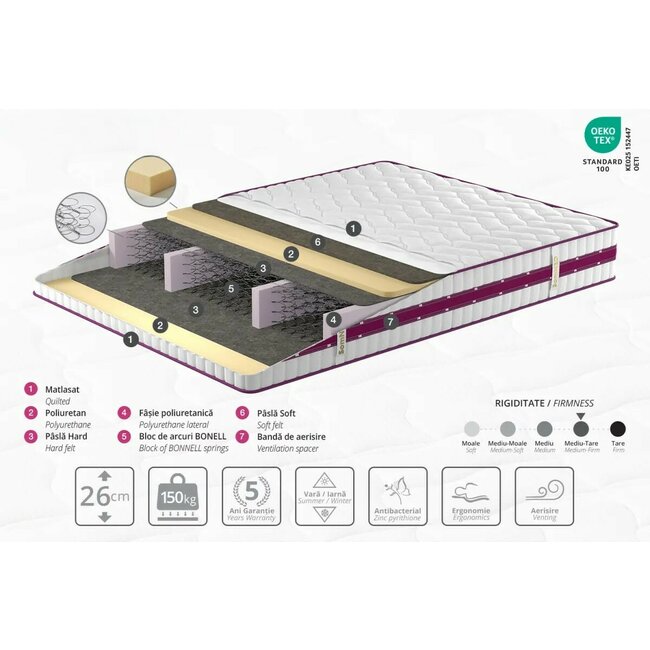 Saltea Somneo Vis ortopedică, Knitted + straturi Pasla Soft/Hard, Arcuri Bonnell, 180x200 cm, Înălțime 26 cm
