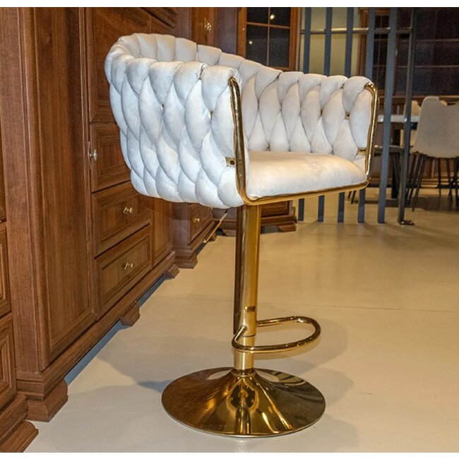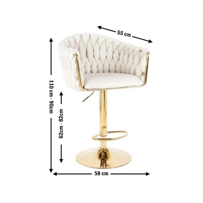Tapițeria din catifea Bej, oferă un aspect luxos și o senzație plăcută la atingere, în timp ce piciorul din metal completează look-ul modern și asigură durabilitatea piesei. Înălțimea șezutului este ajustabilă între 62 și 82 cm, adaptându-se perfect diferitelor înălțimi de bar sau blat.