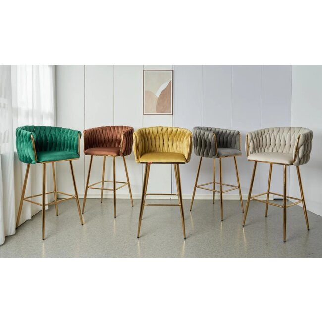 Scaunul de bar SUN, cu tapițerie MARO și picioare metalice aurii, adaugă un aer rafinat și modern oricărui bar sau bucătării.