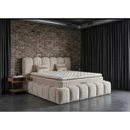 Patul Cosmos are o structură rectangulară standard, dar cu un cadru foarte gros și tapițat, care îi conferă un aspect robust și confortabil.