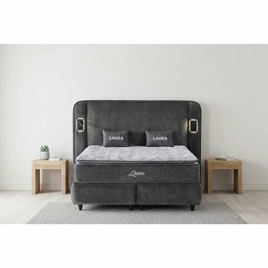 Pat tapițat cu Saltea Gratis, Laura 160x200 cm gri cu somieră rabatabilă, ladă depozitare