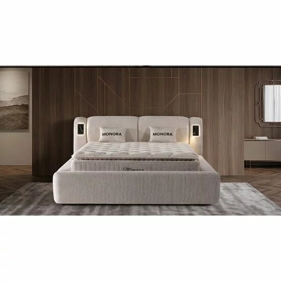Patul Monora are o structură rectangulară standard, dar cu un cadru foarte gros și tapițat, care îi conferă un aspect robust și confortabil. Material tapițerie:este realizat din țesătură Bouclé (moale și texturată) sau catifea premium in functie de preferintele clientilor .