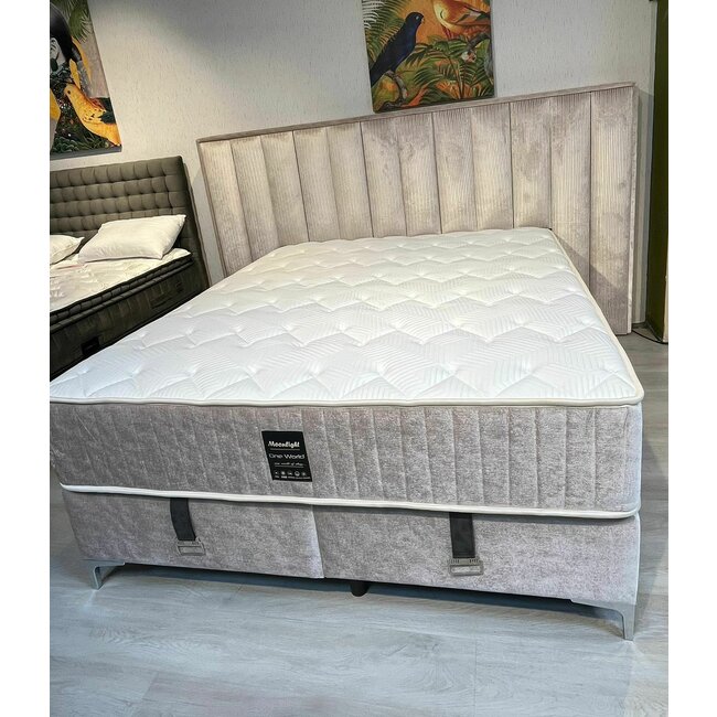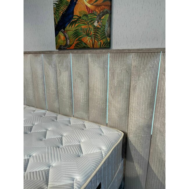 Patul MOONLIGHT în nuanță bej cald combină designul luxos cu confortul funcțional, evidențiat de impresionanta tăblie tapițată, cu panouri verticale și iluminare LED integrată pe toată înălțimea.
