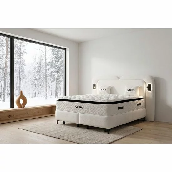 Baza patului este de tip Boxspring (somieră tapițată), oferind o susținere superioară. Salteaua are un model Pillow-Top multi-strat, concepută pentru o relaxare profundă a coloanei.