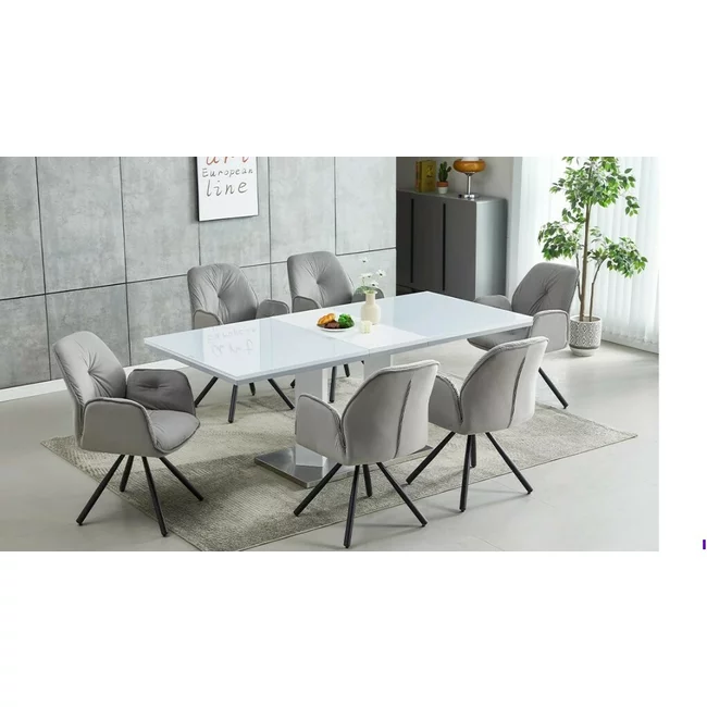 Set masă extensibilă Angola cu 6 scaune, MDF și metal, 160/200x90x76 cm, alb lucios, tapițerie gri