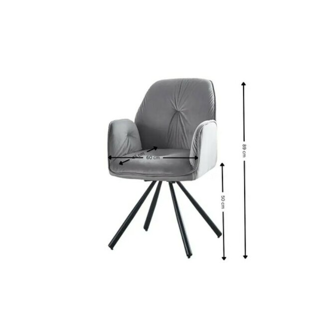 Tapiteria gri, moale și plăcută la atingere, se îmbină perfect cu picioarele solide metalice de culoare neagră, creând un contrast subtil și elegant.