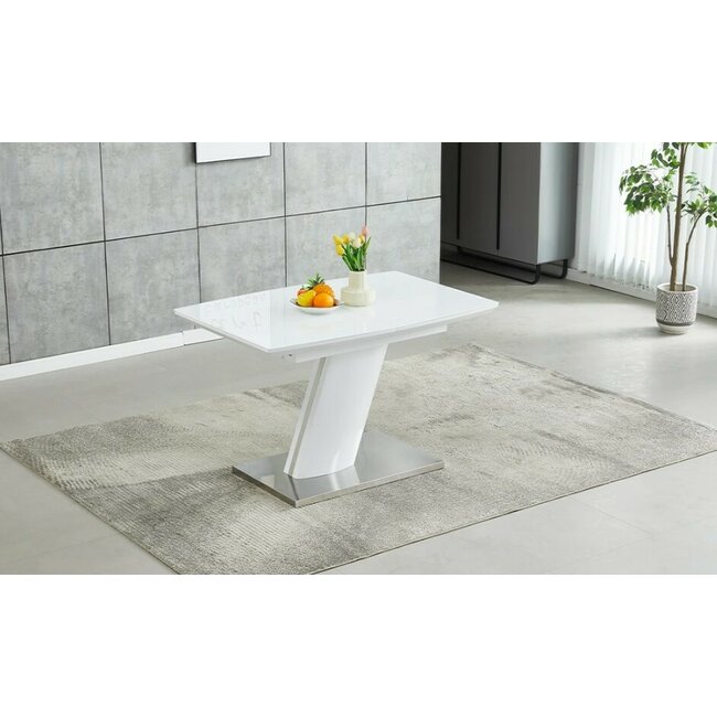 Masa, cu un finisaj alb strălucitor și un blat ceramic ușor de întreținut, adaugă o notă de prospețime și eleganță în orice încăpere.