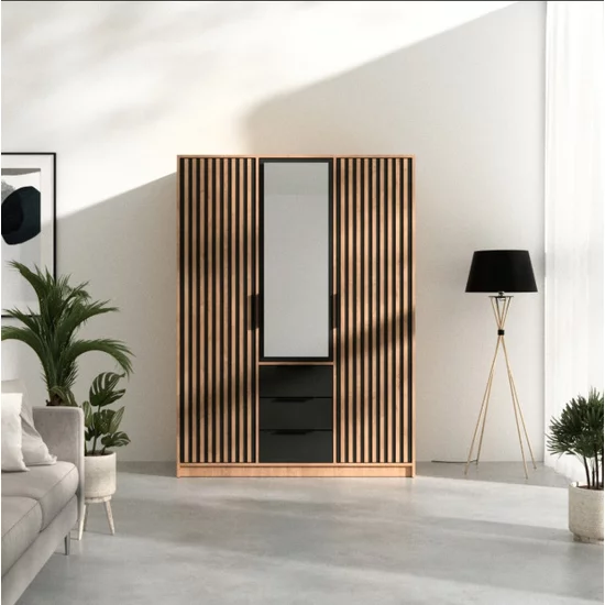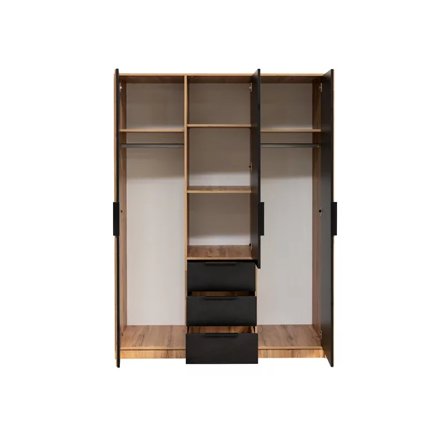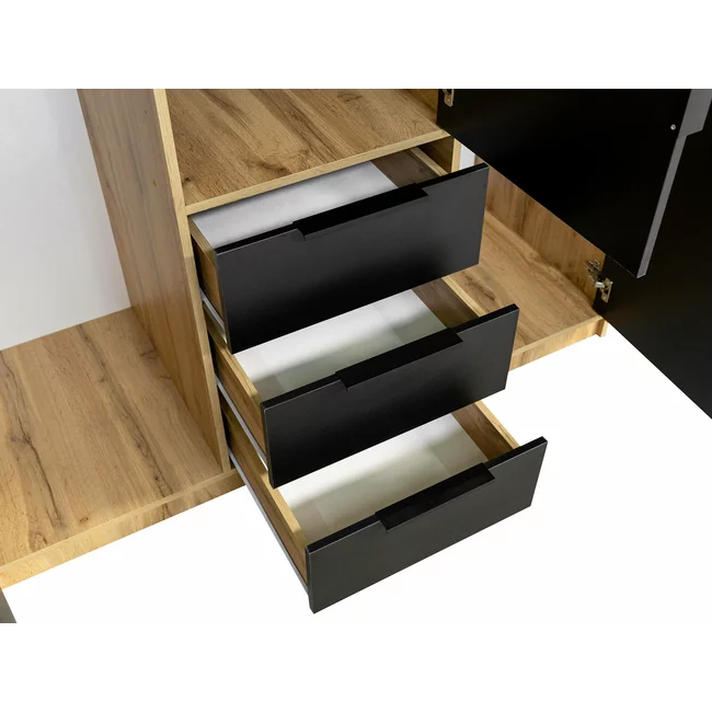 Dulap Bali D3 Lux, oglindă, bară haine, 3 sertare, PAL laminat, 200x147x58 cm, negru