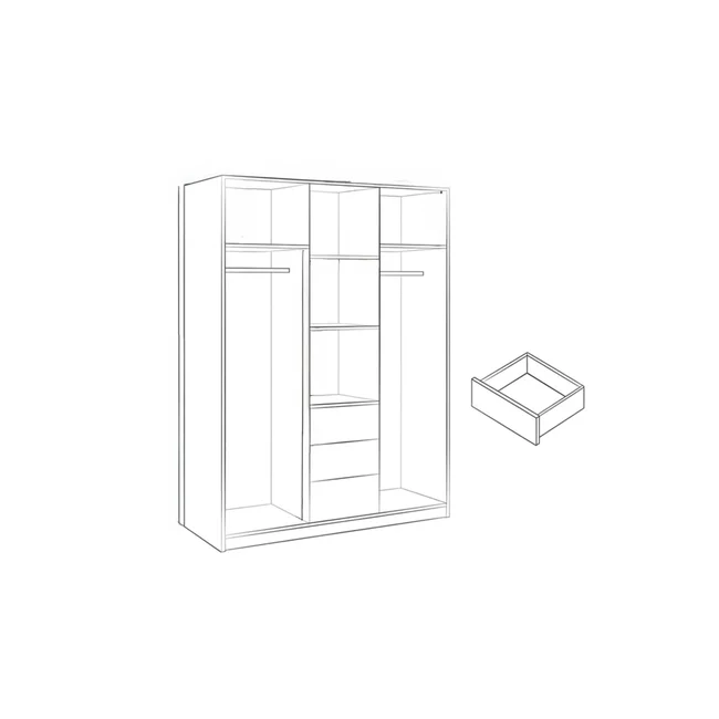 Dotare: 1 bară pentru haine, rafturi, 3 sertare, bandă decorativă aurie