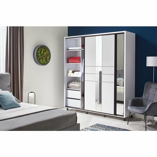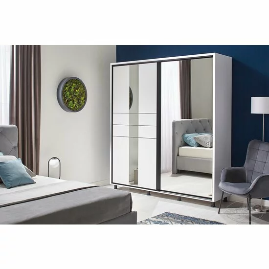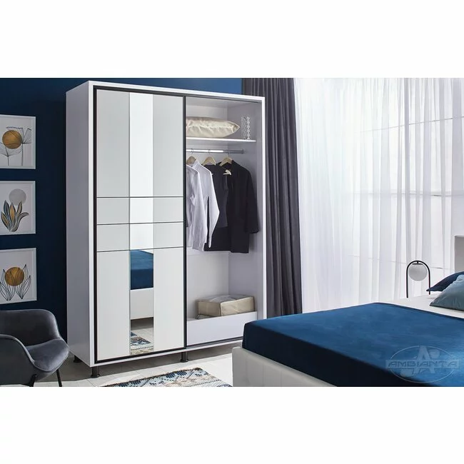 Dulapul cu uși glisante este disponibil în 4 nuanțe și specific pentru model este că una dintre ușile culisante este acoperită cu o oglindă mare, iar a doua cu rame decorative speciale și oglinzi mai mici, caracteristice setului .