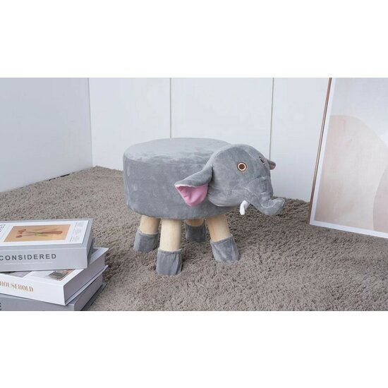 Taburet copii Elefant, tapițat cu material moale și structură din lemn, 38x28x28 cm, gri